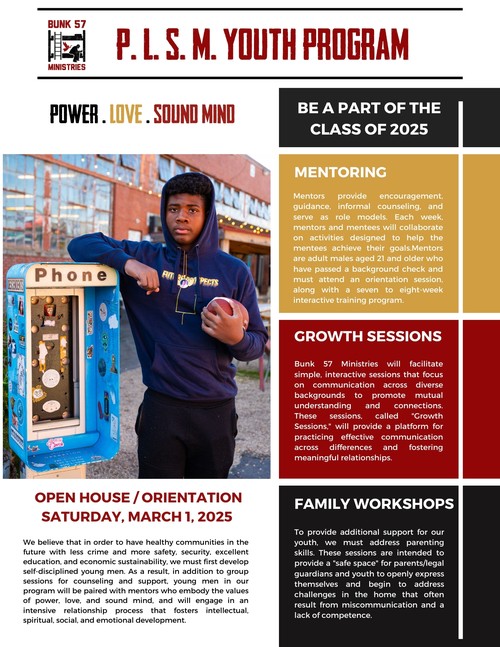 📢 Bunk 57 Ministries Presents: P.L.S.M. (Power-Love-Sound Mind) Youth Program Open House & Orientation!